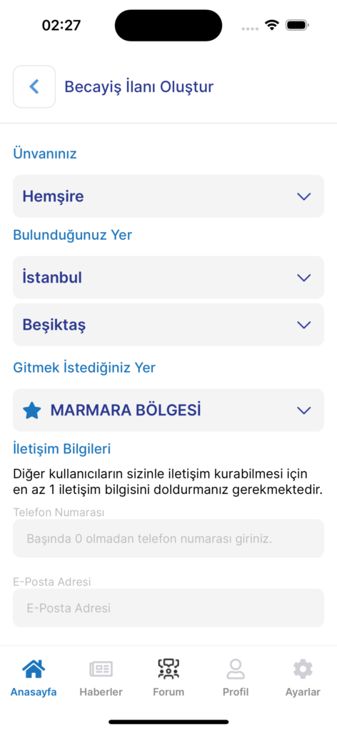Uygulamamızın yeni versiyonuyla birlikte becayiş ilanı özelliği eklenmiştir. Becayiş İlanı sayfasından diğer sağlık çalışanlarının eklediği ilanları görebilir veya arama yapabilirsiniz. Ayrıca kendiniz yeni bir ilan oluşturarak diğer sağlık çalışanlarıyla iletişim sağlayabilirsiniz.